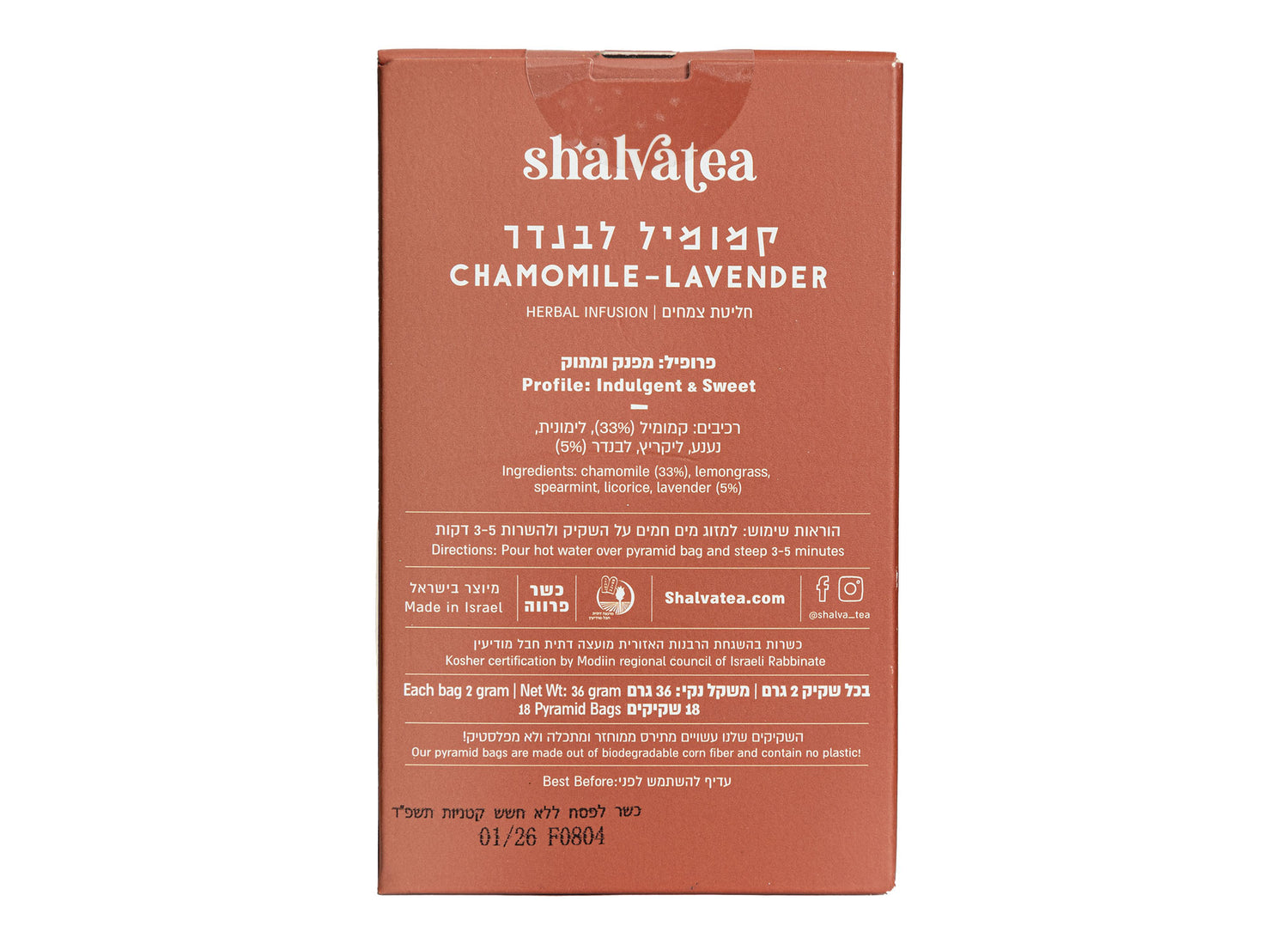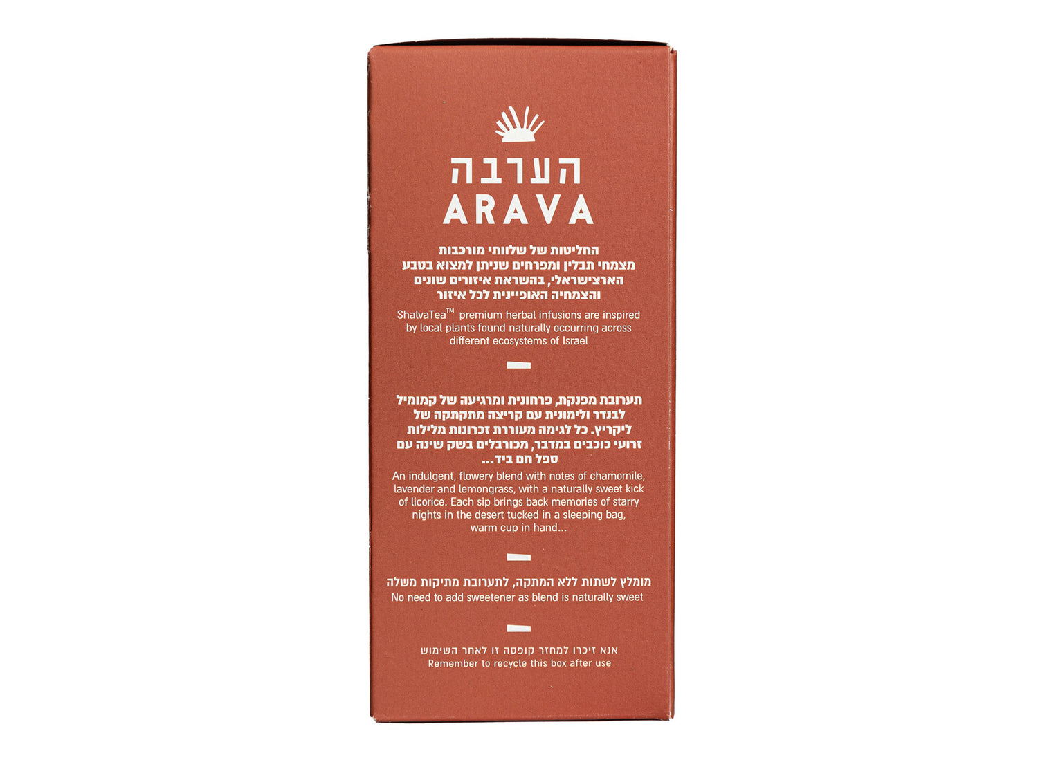 It is named after the Arava Valley, a stop in the ancient incense route connecting the Middle East with Africa. The Arava Valley has various aromatic herbs nestled far below sea level. Perfect before bed, for an upset stomach, or whenever you need to relax.
